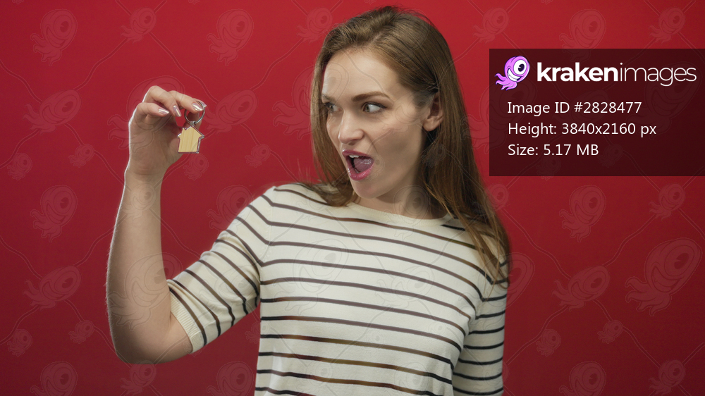 Young woman holds house keychain in right hand and flashes peace sign with left hand in studio; homeownership celebration success excitement.