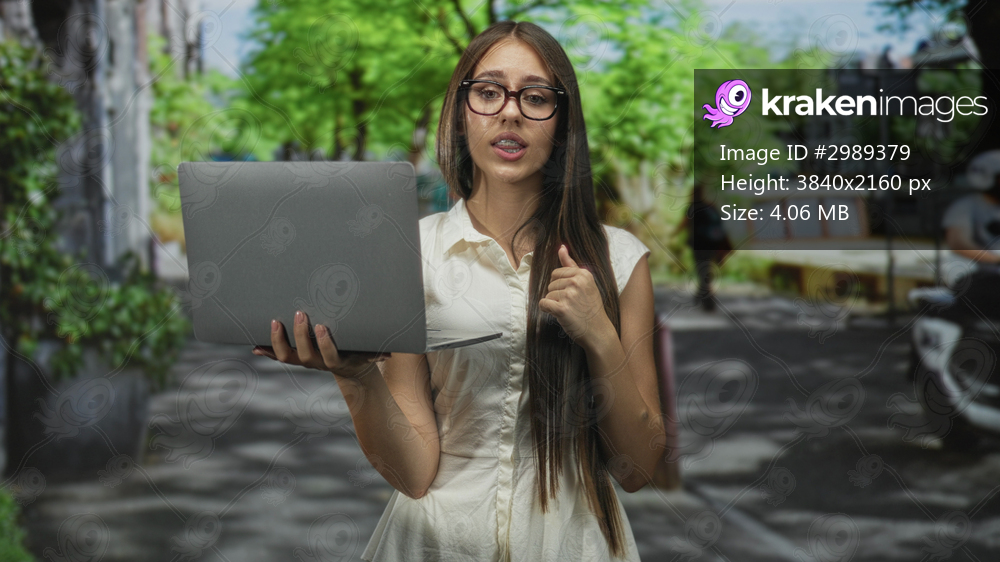 Young woman holds laptop and points finger at screen on street with trees and bench; tech demo curiosity.
