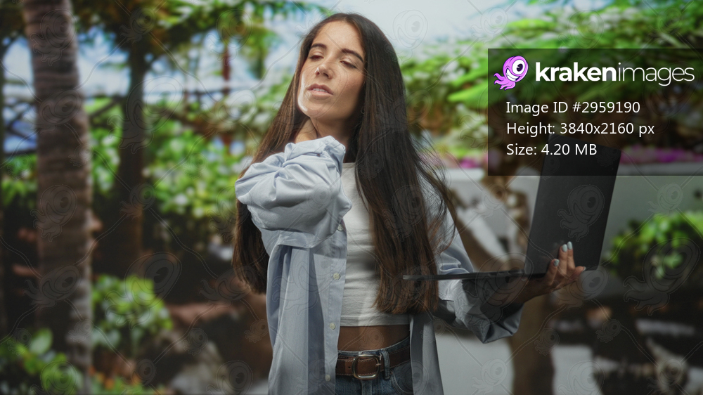 Young woman holds laptop and rubs her neck in a building courtyard framed by palm trees and tropical plants, appearing tense; discomfort.