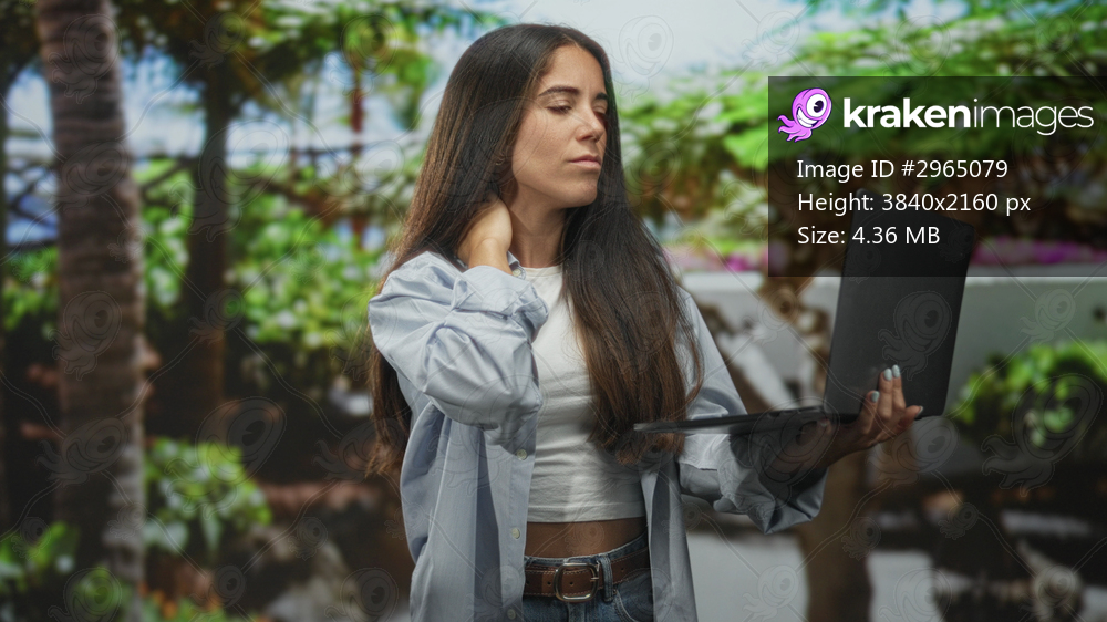 Young woman holds laptop and rubs her neck in a building courtyard framed by palm trees and tropical plants, appearing tense; discomfort.