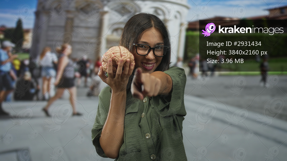 Young woman holds model brain and points finger at building near pisa tower plaza; curiosity education learning.