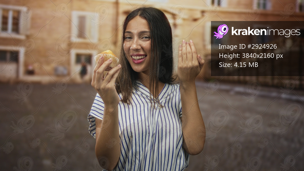 Young woman holds muffin and beckons with fingers on a cobblestone street beside an old building in town; playful invitation.