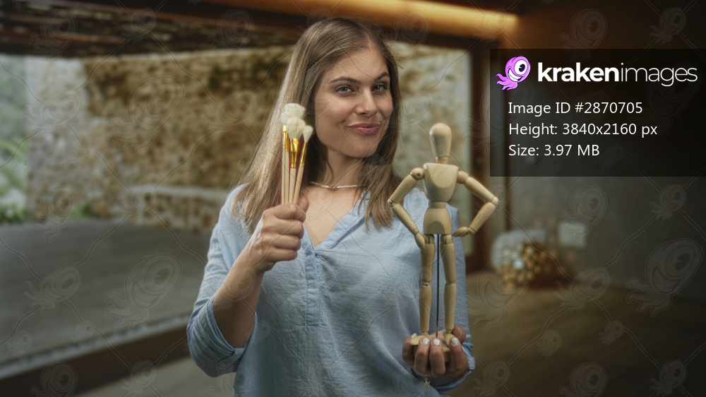 Young woman holds paintbrushes and wooden mannequin with both hands in a bright studio; creative confidence.