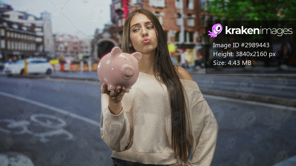 Young woman holds pink piggy bank in outstretched hand on a city street with bicycle lane markings; financial worry.