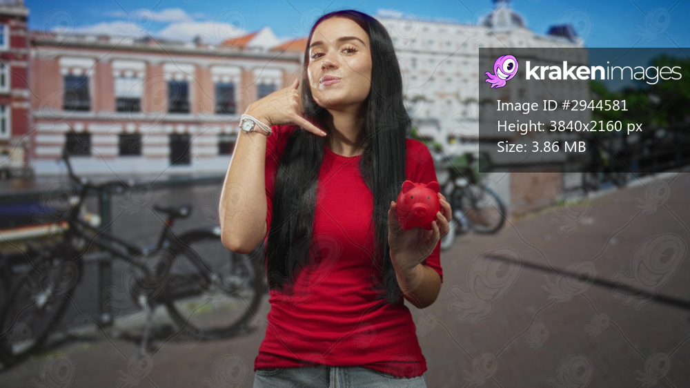 Young woman holds red piggy bank and makes phone gesture with bare hand on street by canal and bicycles; financial optimism.
