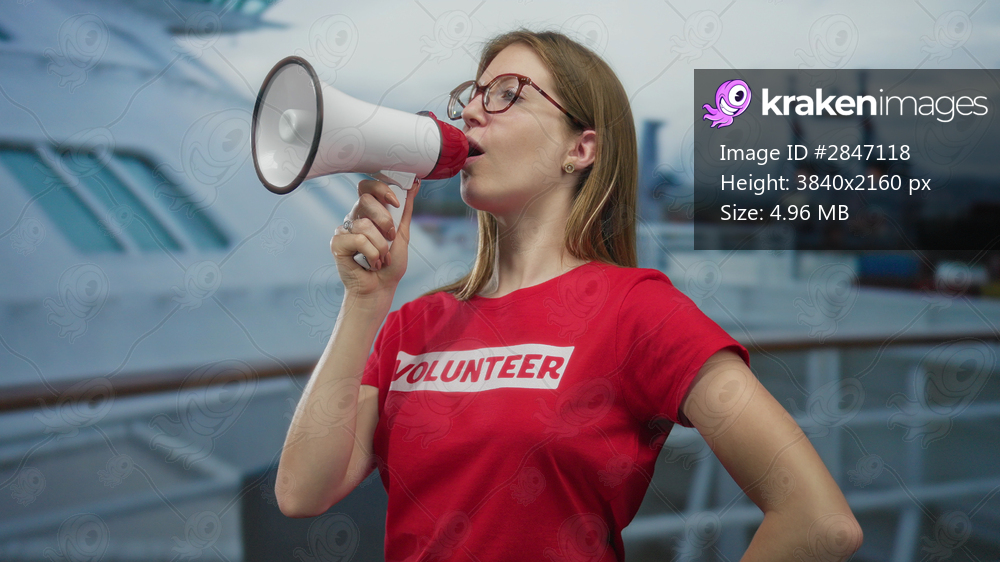 Young woman holds red and white megaphone on cruise ship deck wearing a volunteer shirt; empowerment.