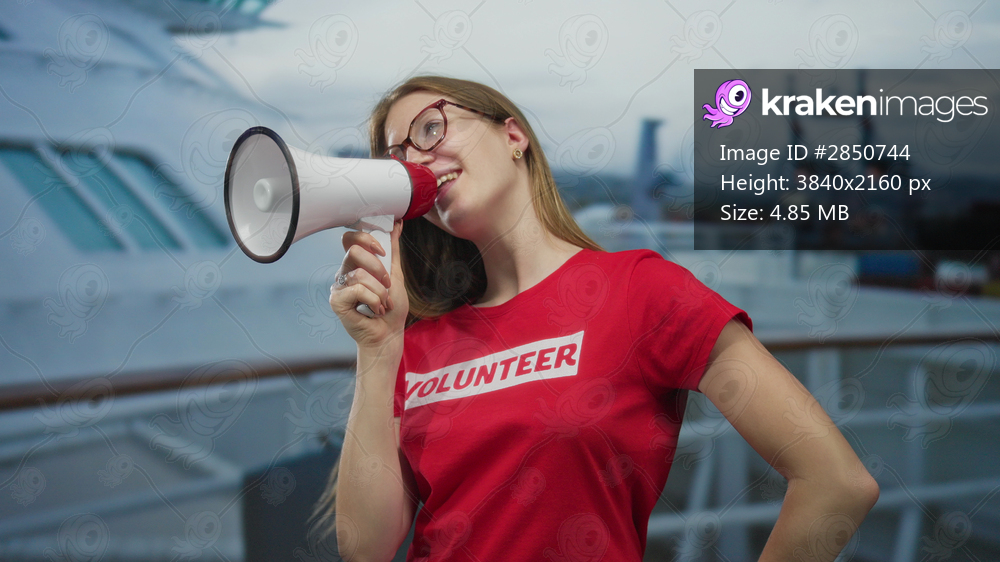 Young woman holds red and white megaphone on cruise ship deck wearing a volunteer shirt; empowerment.