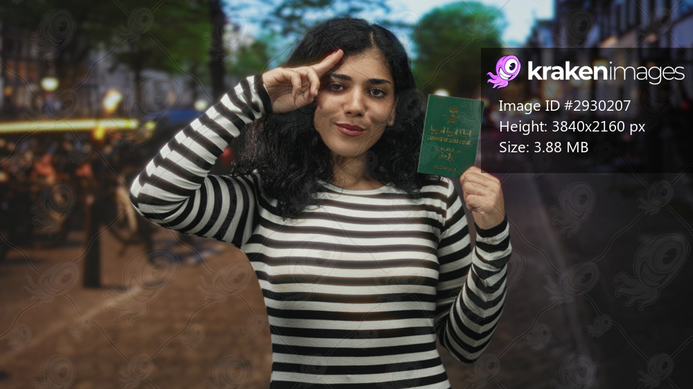 Young woman holds saudi passport up on a city street at dusk, raised arm and smiling in black and white striped top; pride travel freedom.
