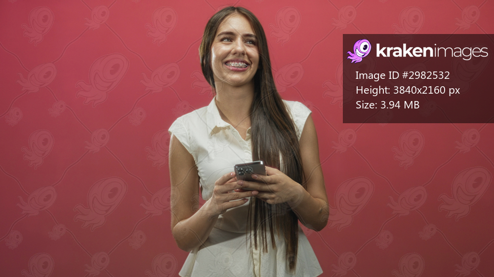 Young woman holds smartphone with both hands in studio, smiling and glancing upward, long hair and white blouse visible; playful curiosity.