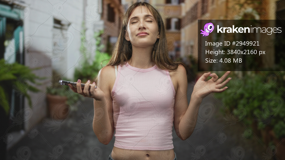 Young woman holds smartphone and gestures with free hand on a street, smiling at camera; playful ease.