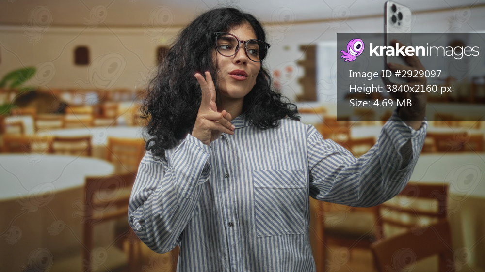 Young woman holds smartphone and makes a peace sign while taking a selfie in a building; playful confidence.