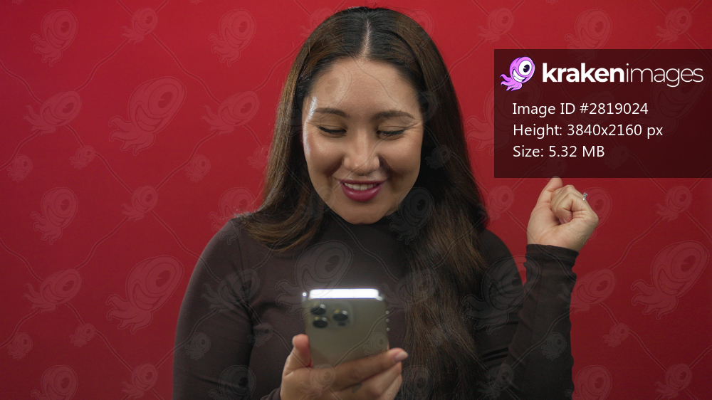 Young woman holds smartphone and raises clenched fist and smiles in red studio; joy celebration success.