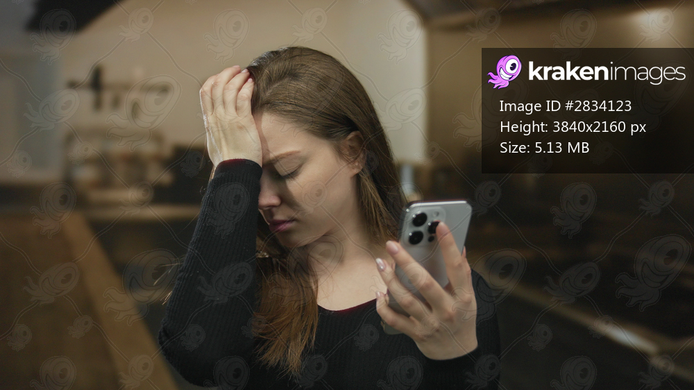 Young woman holds smartphone and rests hand on forehead in modern kitchen building interior looking at screen with furrowed brow and tense posture; frustration. - Kraken Images