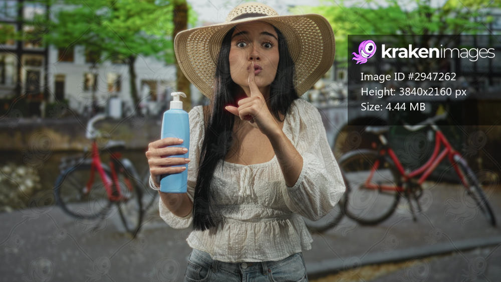 Young woman holds sunscreen bottle with finger to lips for silence on a street by a canal and parked bicycles, wearing a wide brim hat and casual jeans; playful secret. - Kraken Images
