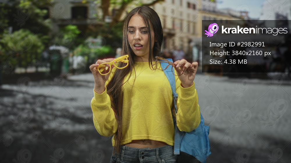 Young woman holds two pairs of eyeglasses while standing in a cobblestone street market, yellow sweater and blue backpack visible; surprise indecision. - Kraken Images