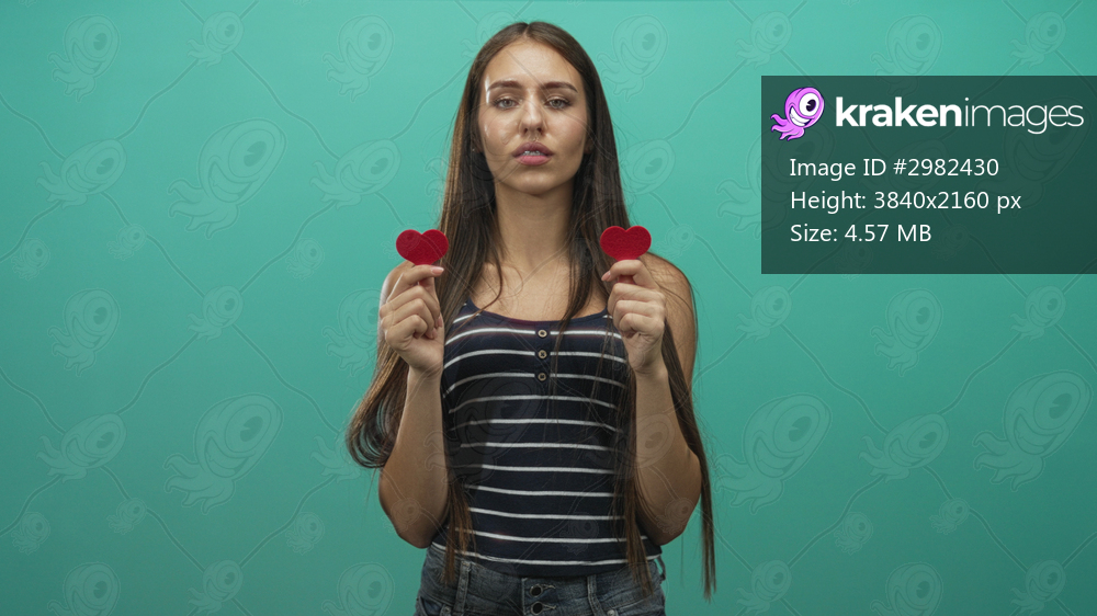 Young woman holds two red felt hearts at chest with visible fingers, mid sequence subtle head turns and eye shifts, studio setting; contemplation.