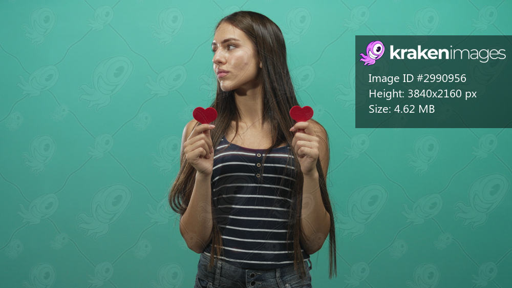 Young woman holds two red felt hearts at chest with visible fingers, mid sequence subtle head turns and eye shifts, studio setting; contemplation.