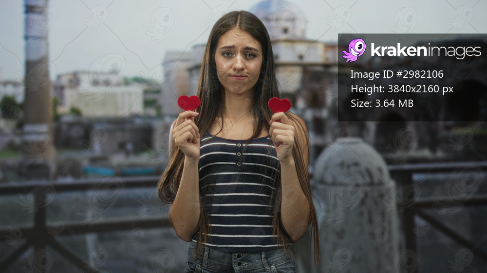 Young woman holds two red heart shapes with both hands and pouts, fingers visible, on an ancient building terrace; heartbreak longing.