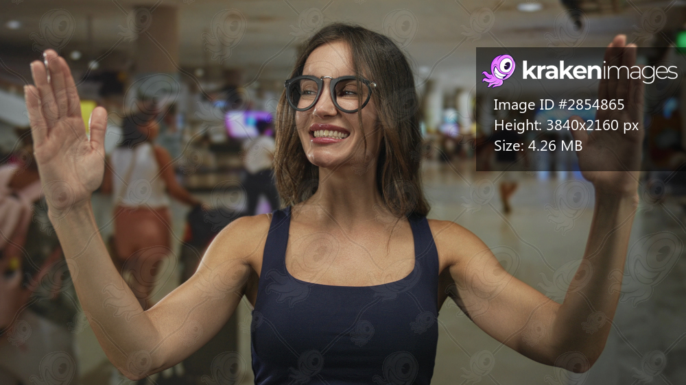 Young woman holds up palms inside crowded airport terminal while maintaining posture and direct gaze; confidence.