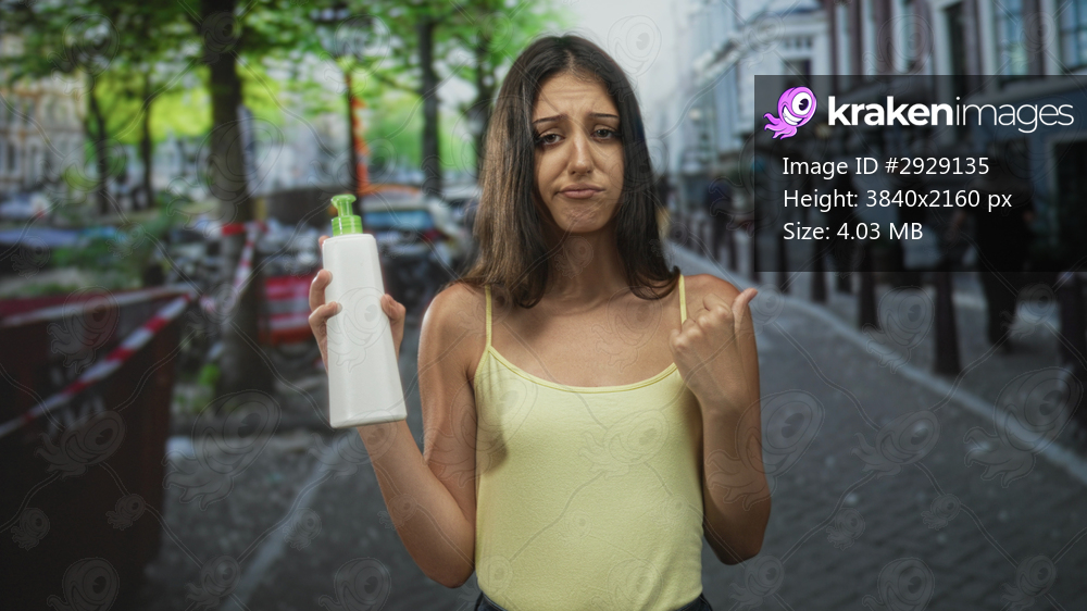 Young woman holds white lotion bottle and points thumb to city street in yellow tank; frustration doubt.
