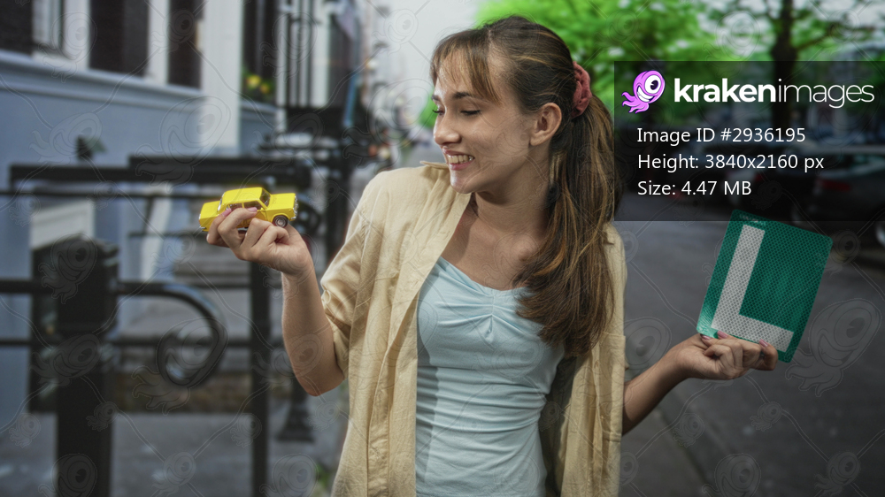 Young woman holds yellow toy car and green learner l plate while smiling on a city street; learner pride.
