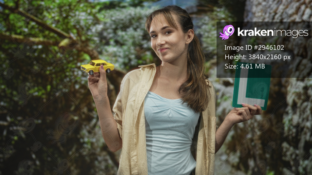 Young woman holds yellow toy car and green learner plate while smiling and standing amid trees and rocks in a forest park setting; learning confidence. - Kraken Images