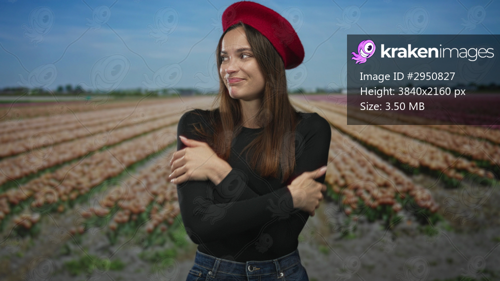 Young woman hugging arms across chest in studio tulip field wearing red beret and black shirt with jeans; serenity comfort.