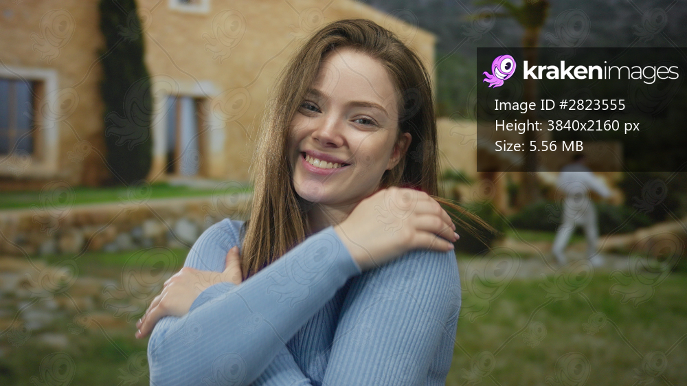 Young woman hugging her arms and smiling at a stone building entrance under warm morning sunlight; serenity.