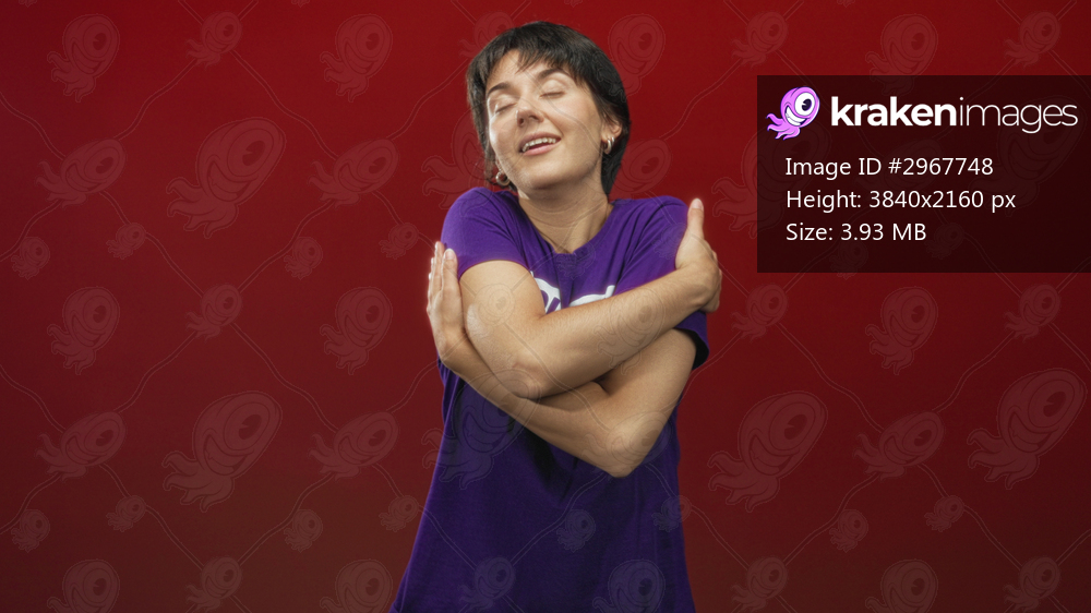 Young woman hugs her arms and smiles wearing a purple volunteer tshirt in a studio; self care contentment.