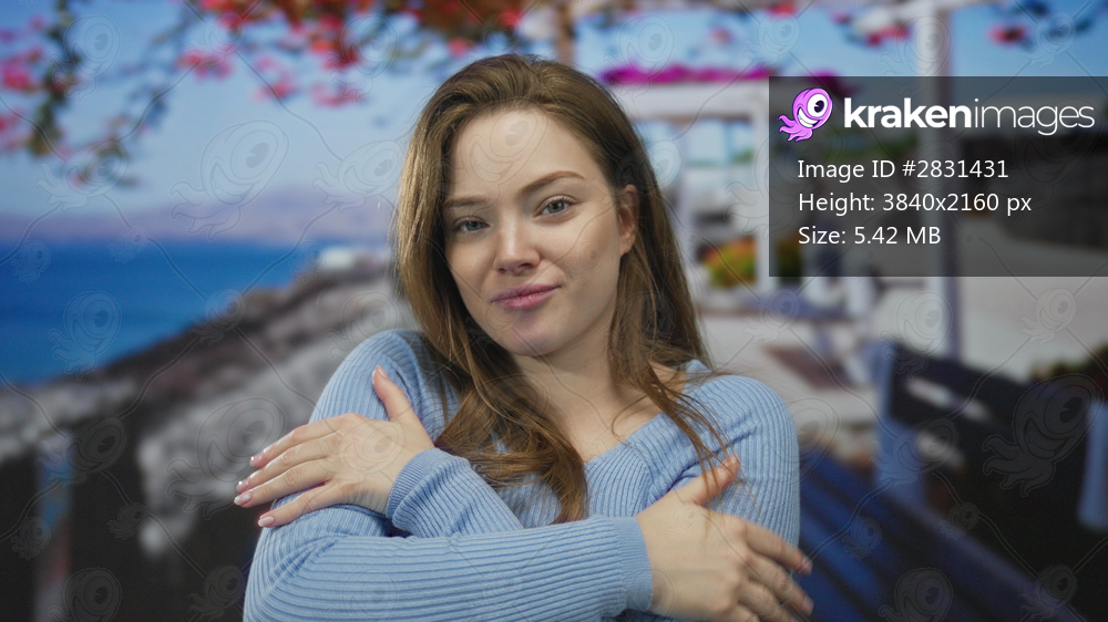 Young woman hugs herself in light blue sweater with eyes closed on sunlit seaside promenade; serenity.