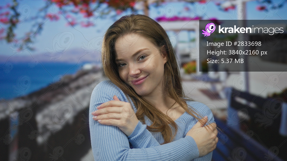 Young woman hugs herself in light blue sweater with eyes closed on sunlit seaside promenade; serenity.