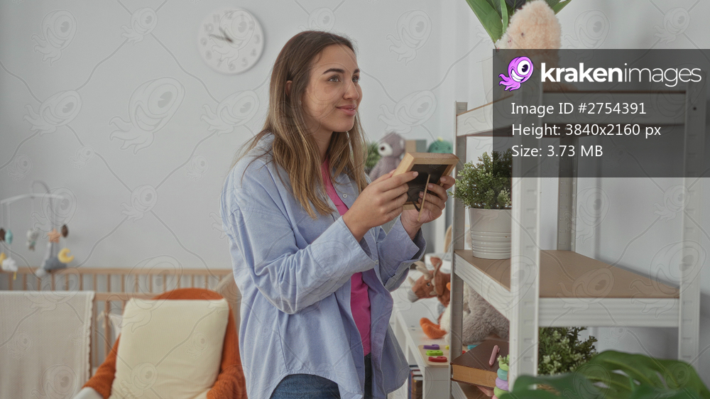Young woman in a bedroom setting arranges a shelf beside a baby crib, surrounded by soft toys and potted plants, creating a calm and nurturing environment indoors. - Kraken Images