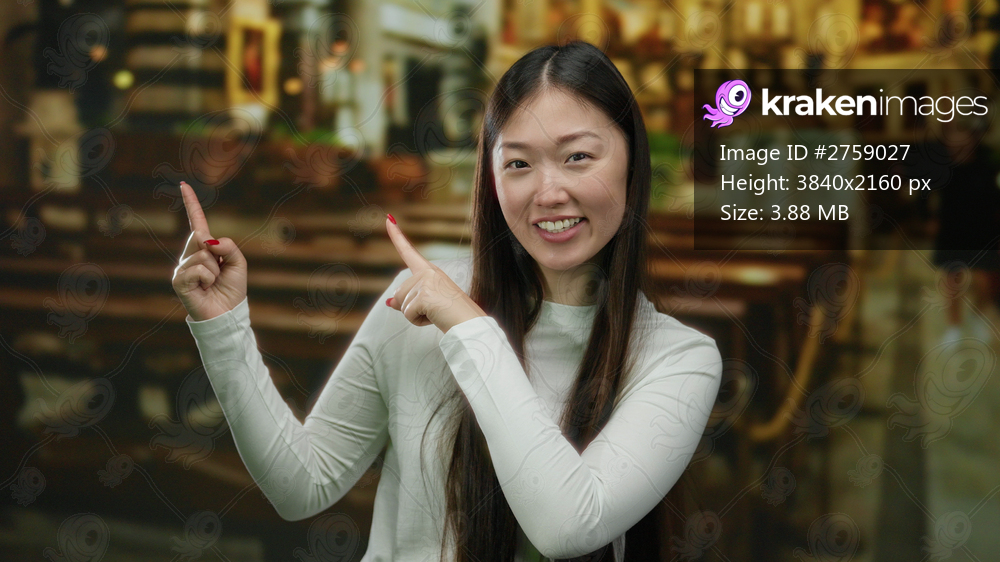 Young woman in a church interior smiling and gesturing with long hair and white shirt, embodying beauty and spirituality in an engaging indoor setting. - Kraken Images