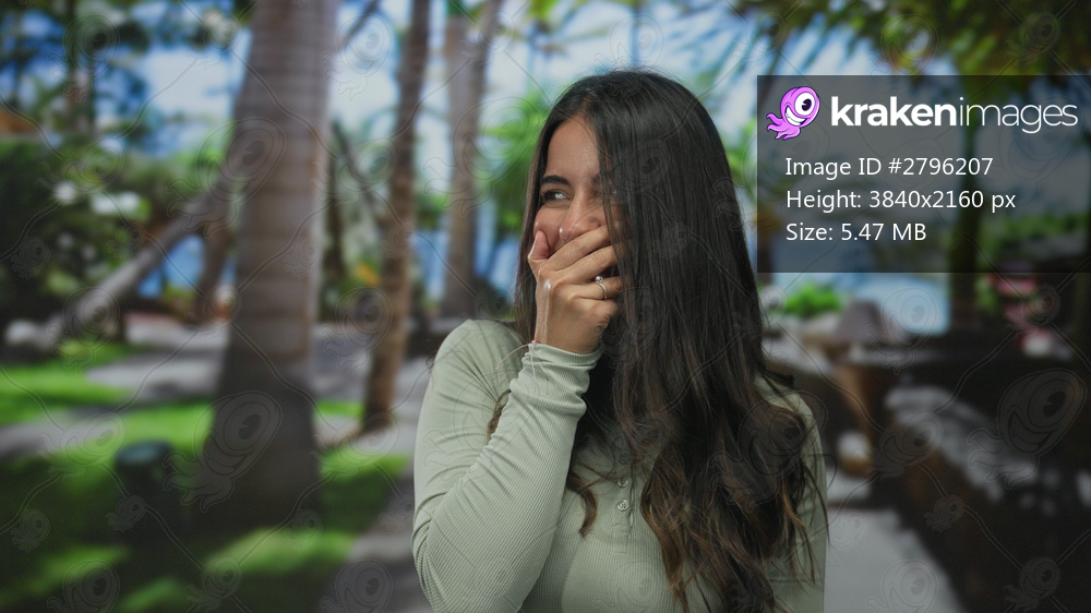 Young woman in a park covering her mouth with a playful smile, surrounded by lush greenery and palm trees under a bright blue sky, embracing the outdoor setting joyfully. - Kraken Images