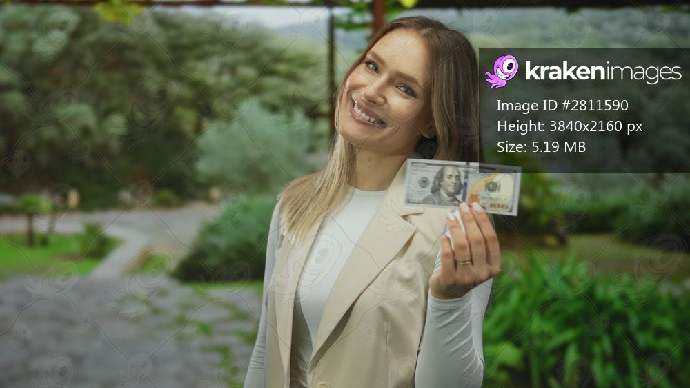 Young woman in a park smiling while holding a us dollar note showcasing happiness and wealth in an outdoor setting