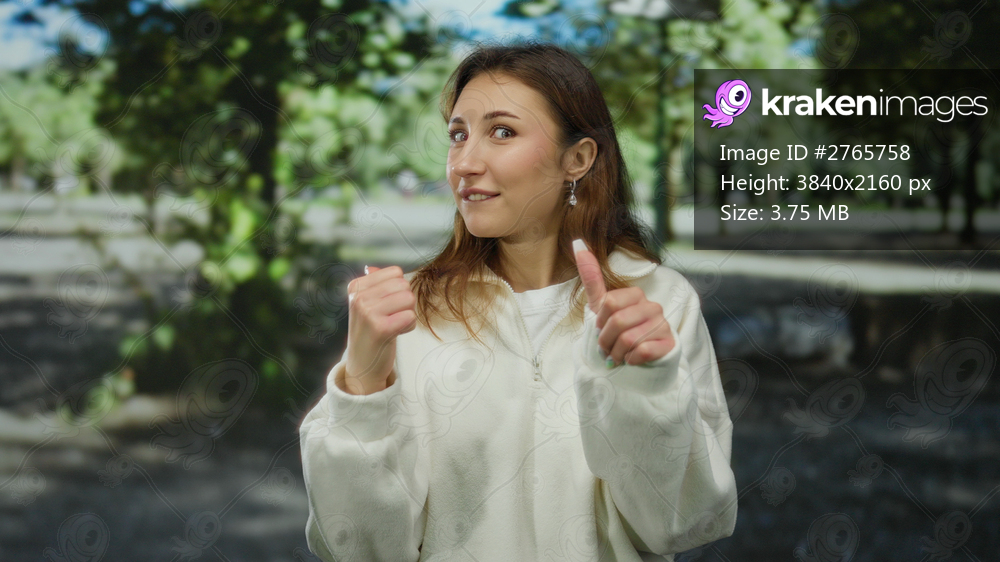 Young woman in a park with thumbs up in a casual outdoor setting surrounded by nature and trees reflecting happiness and enjoyment in a light sweatshirt. - Kraken Images