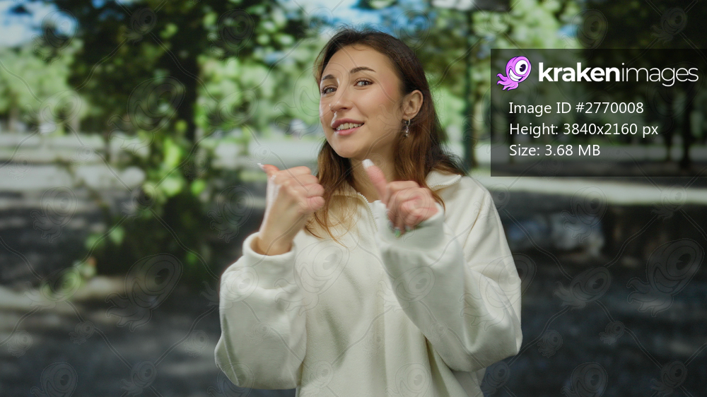 Young woman in a park with thumbs up in a casual outdoor setting surrounded by nature and trees reflecting happiness and enjoyment in a light sweatshirt. - Kraken Images