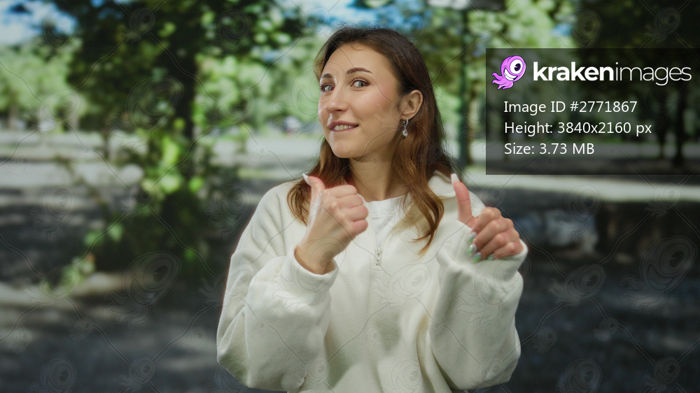Young woman in a park with thumbs up in a casual outdoor setting surrounded by nature and trees reflecting happiness and enjoyment in a light sweatshirt. - Kraken Images