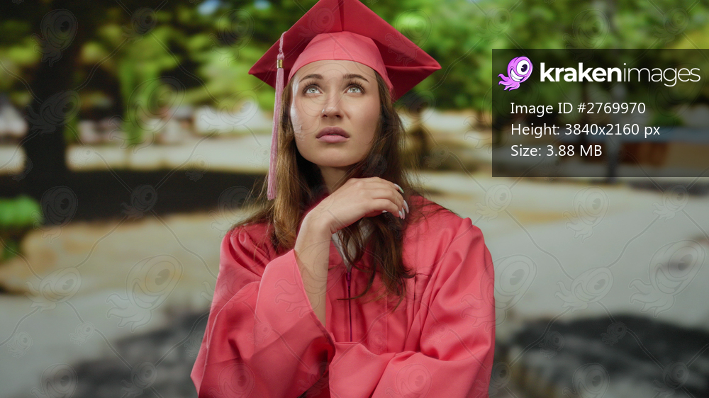 Young woman in a pink graduation gown in a sunny park, appearing emotional and serene in her academic achievement moment.