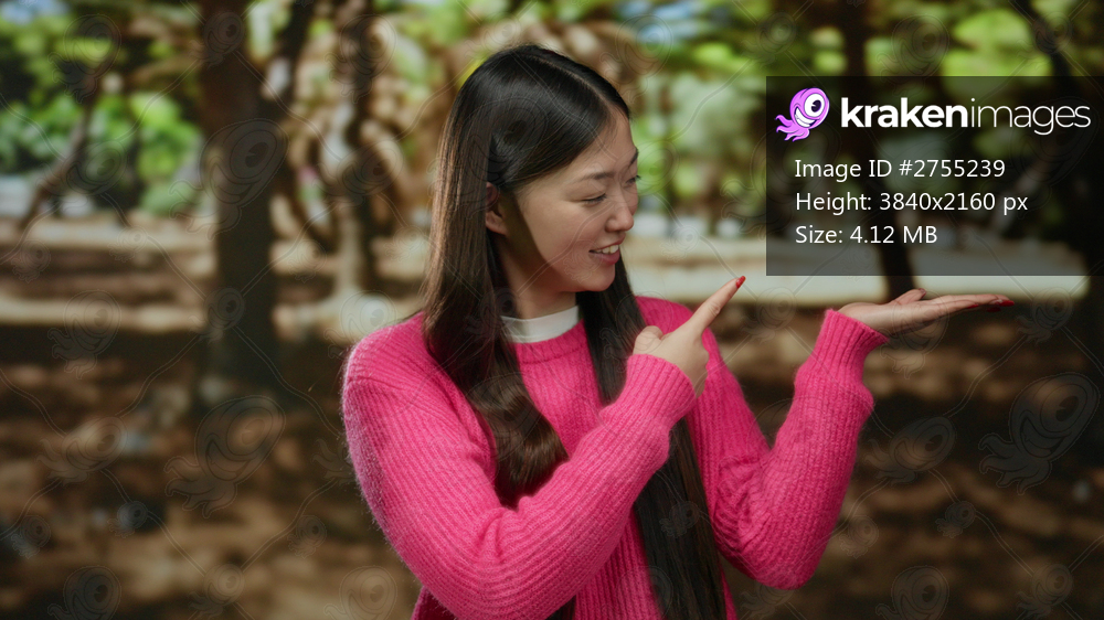 Young woman in a pink sweater gestures with a smile in a sunny park setting, surrounded by lush green trees, showcasing a cheerful and relaxed outdoor atmosphere. - Kraken Images