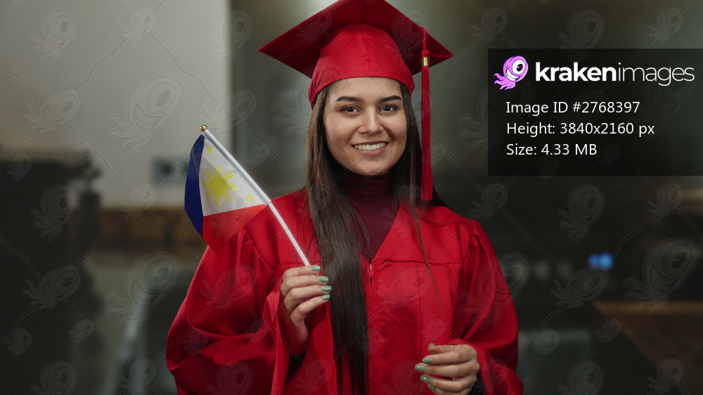 Young woman in a red graduation gown holding a philippines flag smiles proudly indoors, symbolizing academic achievement and cultural pride in a kitchen setting. - Kraken Images