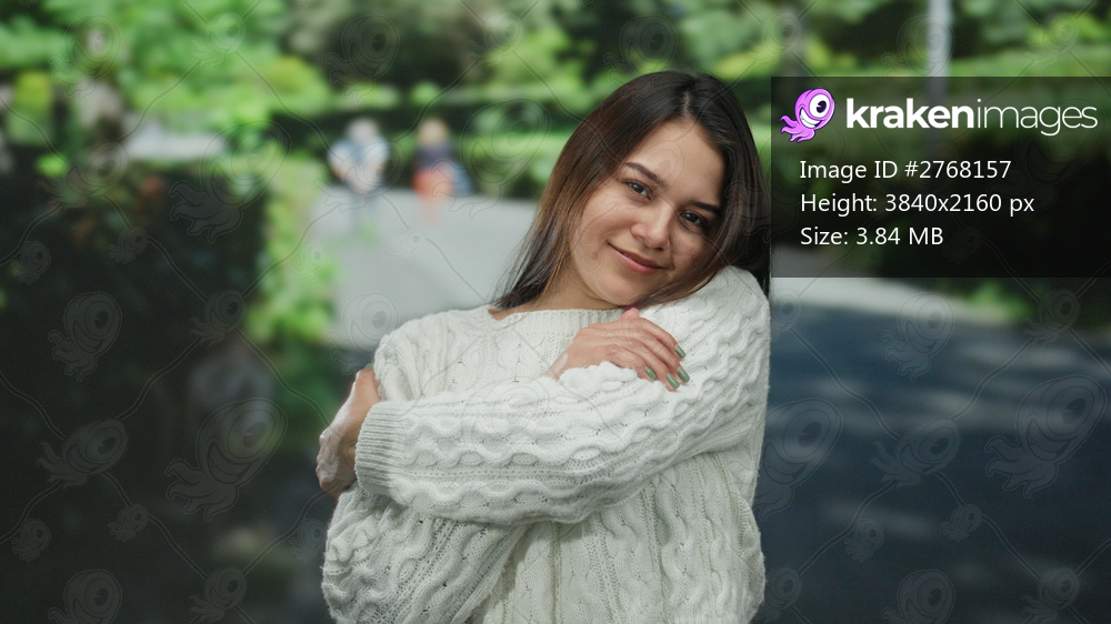 Young woman in a white sweater embraces herself with a warm smile, enjoying a peaceful moment in a sunny outdoor park setting.