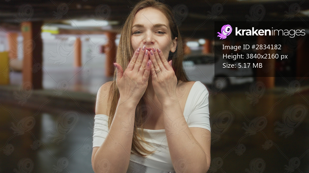 Young woman in a white top blows kiss with both hands toward camera among cars inside a building; flirtation.