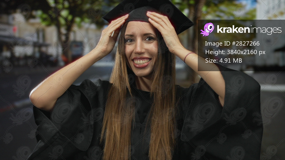 Young woman in academic gown dancing with raised fists on bustling city street; achievement moment celebration joy.