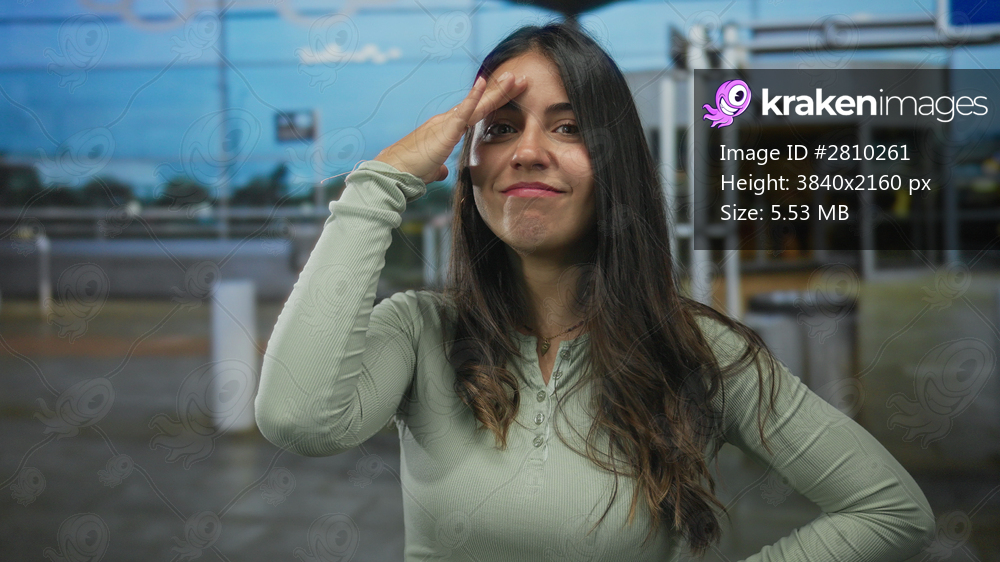 Young woman in airport terminal outdoors with a playful expression wearing a green shirt against a backdrop of busy travelers and airport signage.