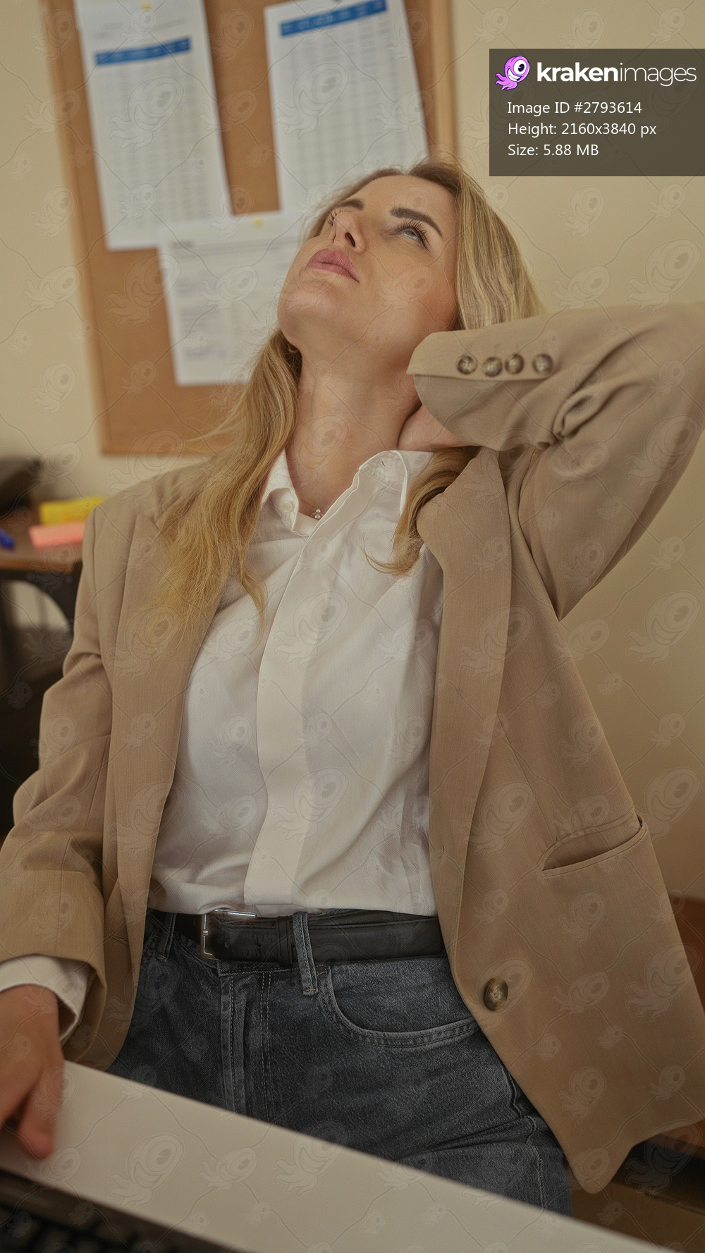 Young woman in an office experiencing neck pain while seated at a desk, working on a computer, expressing discomfort indoors, wearing professional attire with a focused expression. - Kraken Images