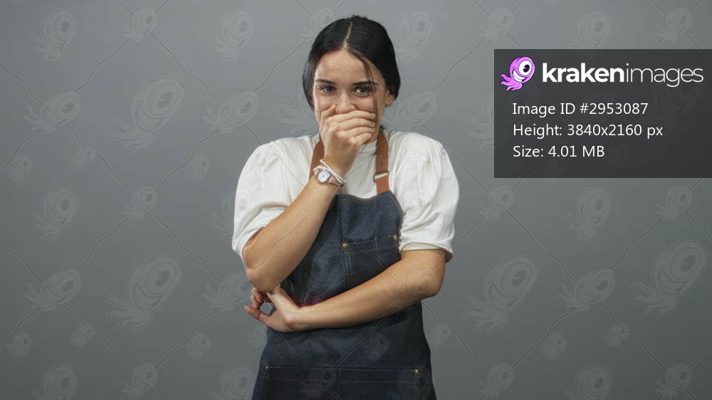 Young woman in apron covers mouth with hand in studio while stifling a laugh and crossing her other arm; surprise hospitality.