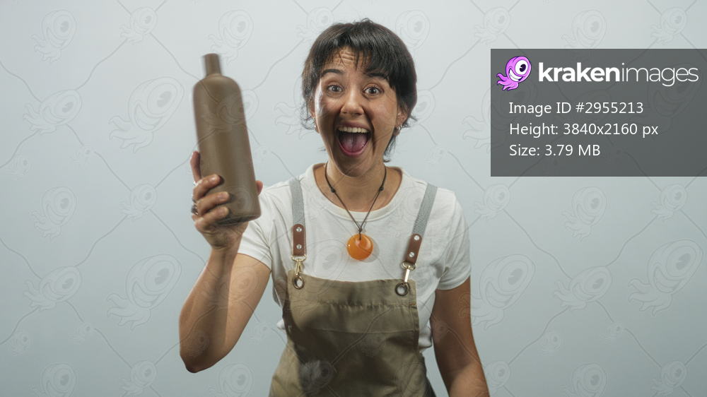 Young woman in apron holding a pottery bottle with one hand and cupping her mouth to shout in a studio; joyful craft promotion.