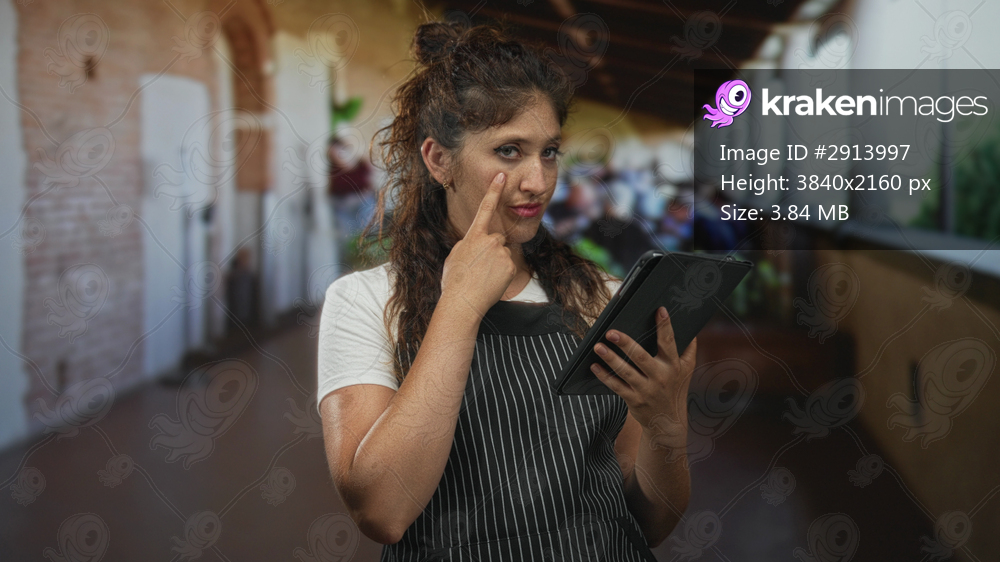 Young woman in apron holding tablet points finger to cheek on a restaurant terrace building with columns and patrons outdoors; service confidence.