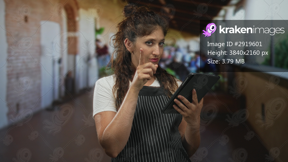 Young woman in apron holding tablet points finger to cheek on a restaurant terrace building with columns and patrons outdoors; service confidence.